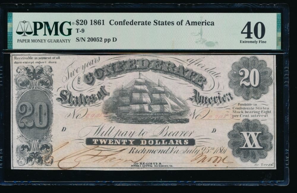 One 1861 $20 T-9 Confederate PMG 40.