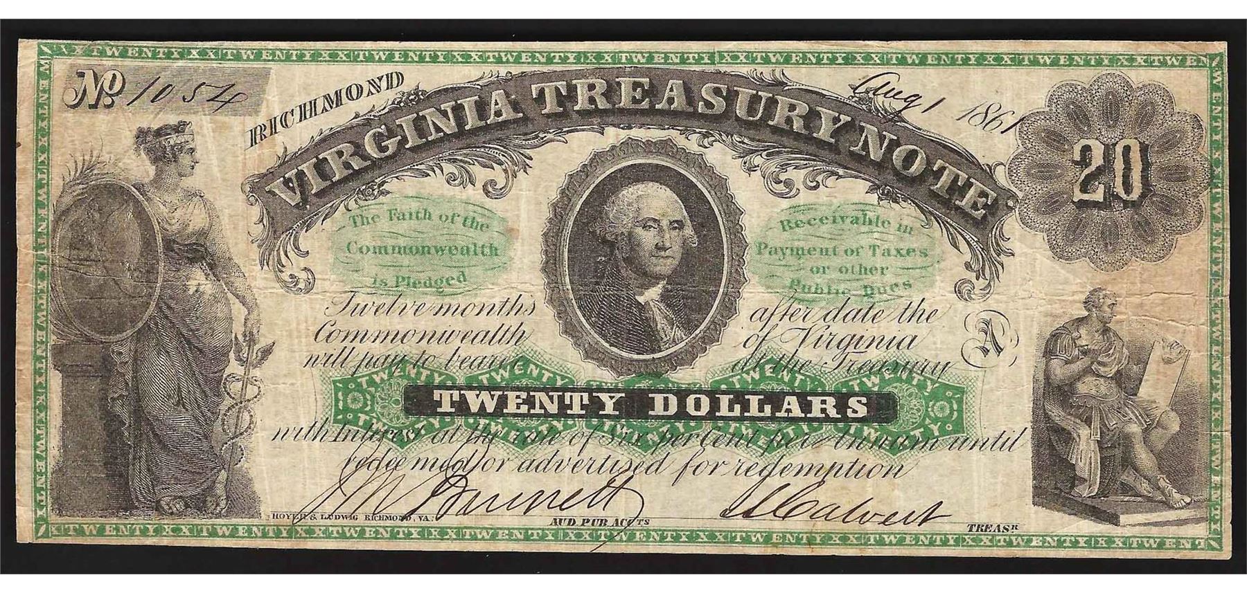 One 1861 $20 Virginia Treasury Obsolete Bank Note.