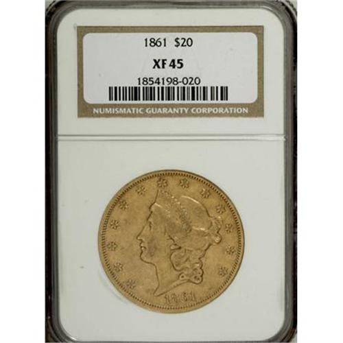 <B>1861 $20 XF45 NGC.</B></I> NGC Census: (290/1753). PCGS Population (179/828). Mintage: 2,976,453. Numismedia Wsl. Price for NGC/PCGS coin in XF45: $707. (#8932)<BR><BR><B>Coin Engraver:</B> James B. Longacre<BR><BR><b>Shipping:</b> Coins & Currency (<a target="_blank" href="http://www.heritageauctions.com/common/shipping.php">view shipping information</a>\)