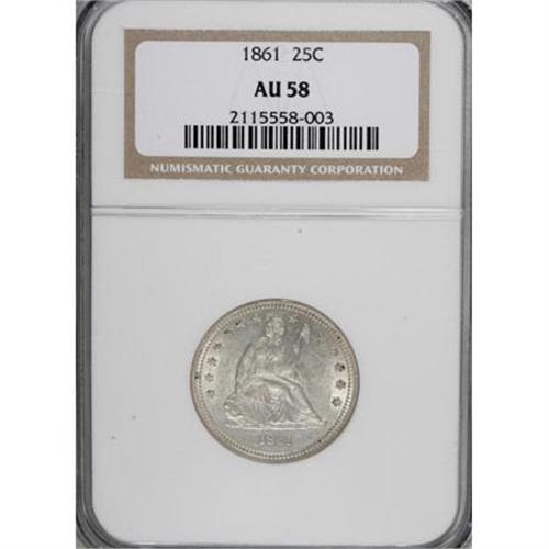 <B>1861 25C AU58 NGC.</B></I> NGC Census: (75/294). PCGS Population (58/308). Mintage: 4,854,600. Numismedia Wsl. Price for NGC/PCGS coin in AU58: $150. (#5454)<BR><BR><B>Coin Engraver:</B> Christian Gobrecht<BR><BR><b>Shipping:</b> Coins & Currency (<a target="_blank" href="http://www.heritageauctions.com/common/shipping.php">view shipping information</a>)