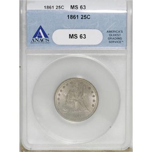 <B>1861 25C MS63 ANACS.</B></I> . NGC Census: (87/131). PCGS Population (93/129). Mintage: 4,854,600. Numismedia Wsl. Price for NGC/PCGS coin in MS63: $565. (#5454)<BR><BR><B>Coin Engraver:</B> Christian Gobrecht<BR><BR><b>Shipping:</b> Coins & Currency (<a target="_blank" href="http://www.heritageauctions.com/common/shipping.php">view shipping information</a>)