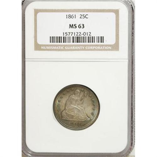 <B>1861 25C MS63 NGC.</B></I> Type Two Obverse and Reverse. Aquamarine, plum-red, and golden-brown enrich the peripheries of this sharply struck and unblemished Civil War quarter. Struck from multiply clashed dies.<BR><BR><B>Coin Engraver:</B> Christian Gobrecht<BR><BR><b>Shipping:</b> Coins & Currency (<a target="_blank" href="http://www.heritageauctions.com/common/shipping.php">view shipping information</a>)