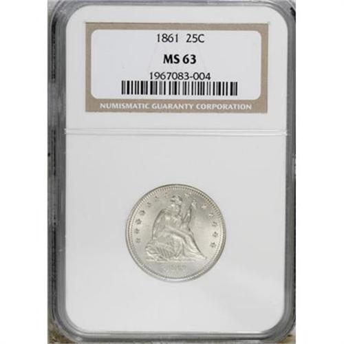 <B>1861 25C MS63 NGC.</B></I> NGC Census: (87/130). PCGS Population (93/129). Mintage: 4,854,600. Numismedia Wsl. Price for NGC/PCGS coin in MS63: $565. (#5454)<BR><BR><B>Coin Engraver:</B> Christian Gobrecht<BR><BR><b>Shipping:</b> Coins & Currency (<a target="_blank" href="http://www.heritageauctions.com/common/shipping.php">view shipping information</a>)