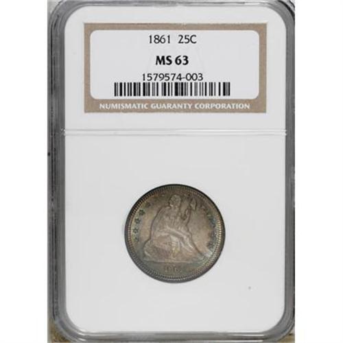 <B>1861 25C MS63 NGC.</B></I> . NGC Census: (87/131). PCGS Population (93/129). Mintage: 4,854,600. Numismedia Wsl. Price for NGC/PCGS coin in MS63: $565. (#5454)<BR><BR><B>Coin Engraver:</B> Christian Gobrecht<BR><BR><b>Shipping:</b> Coins & Currency (<a target="_blank" href="http://www.heritageauctions.com/common/shipping.php">view shipping information</a>)
