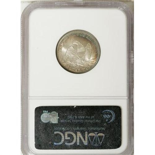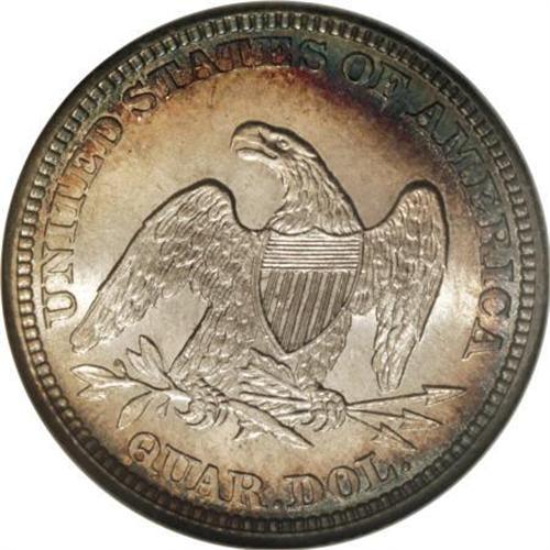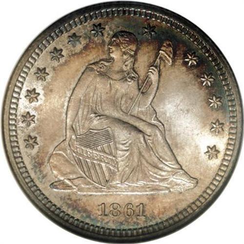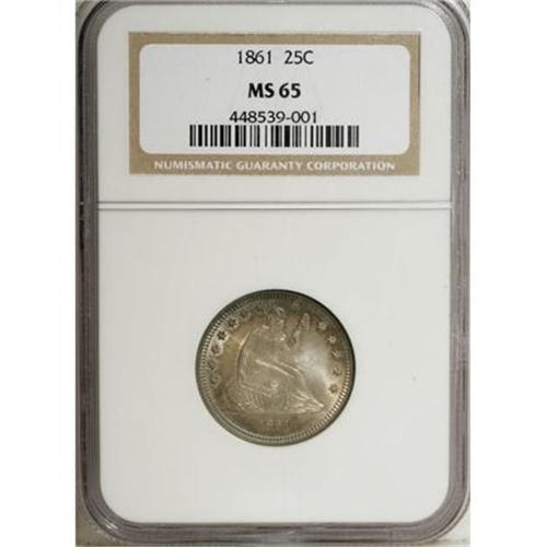 <B>1861 25C MS65 NGC.</B></I> Type Two Obverse, with shield lines above the E in LIBERTY, and Type Two Reverse, with a convex eye on the eagle. One of the more available No Motto quarters and occasionally available in the better grades of Uncirculated. The mint luster is softly frosted and essentially uninterrupted by abrasions. Light golden toning is encircled by blue at the margins with much lighter centers. Sharply struck throughout. <BR><BR><B>Coin Engraver:</B> Christian Gobrecht<BR><BR><b>Shipping:</b> Coins & Currency (<a target="_blank" href="http://www.heritageauctions.com/common/shipping.php">view shipping information</a>)