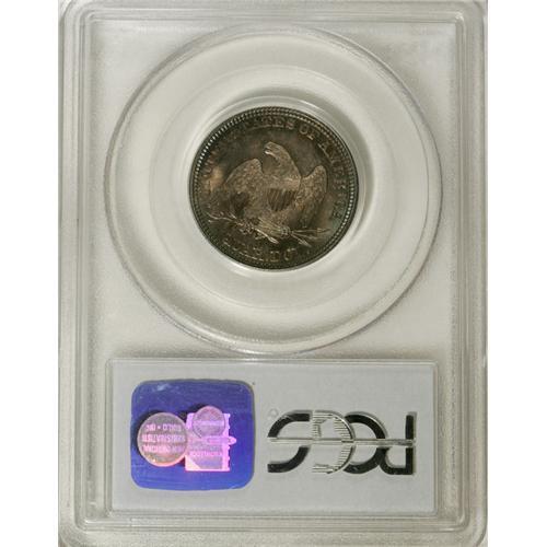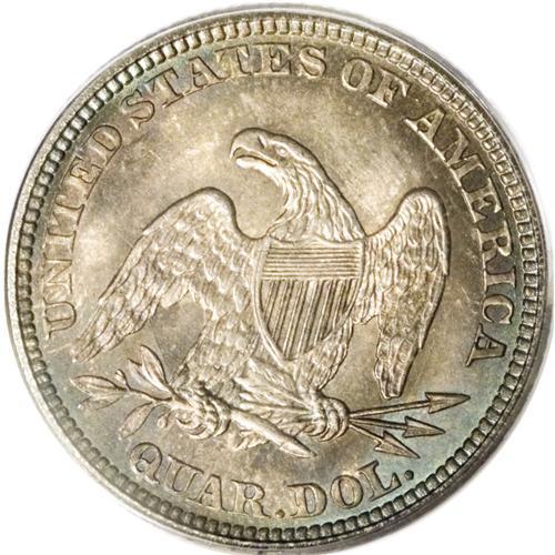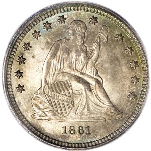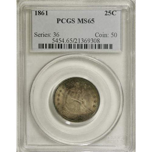 <B>1861 25C MS65 PCGS.</B></I> Type Two Obverse, with shield lines above the E in LIBERTY, and Type Two Reverse, with a convex eye on the eagle. Light gray toning dominates the obverse, accented with blushes of cobalt-blue, lilac, and apple-green, while slightly deeper hues of gray, cobalt-blue, and lilac are about evenly distributed over the reverse. Exquisite delineation characterizes the design elements, which are lightly frosted. The surfaces emit glowing luster, and reveal just a couple of minor marks well within the parameters of the grade designation. Great overall eye appeal. Population: 31 in 65, 13 finer (2/07).<BR><BR><b>Shipping:</b> Coins & Currency (<a target="_blank" href="http://www.heritageauctions.com/common/shipping.php">view shipping information</a>)