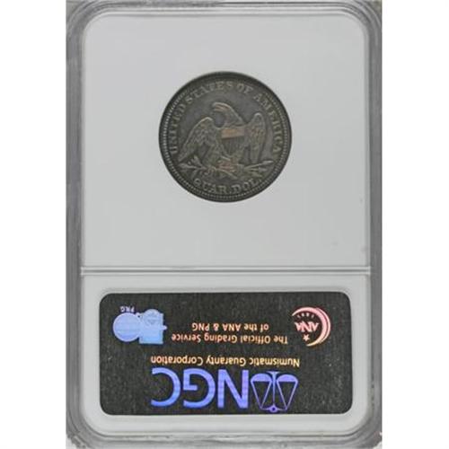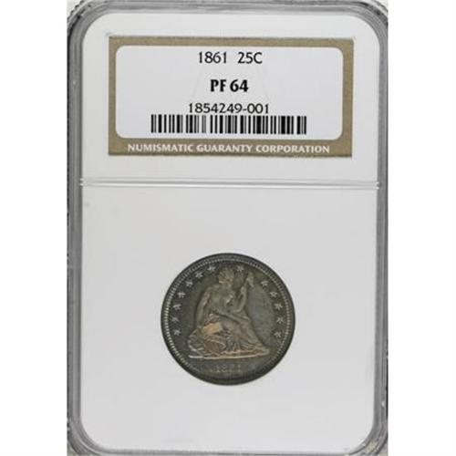 <B>1861 25C PR64 NGC.</B></I> An exactingly struck near-Gem that offers pleasing reflectivity beneath rich patina. Both sides have vibrant peach and orange toning in the centers and blue-green at the peripheries. Faint hairlines in the fields define the grade. Census: 22 in 64, 20 finer (6/07).<BR><BR><B>Coin Engraver:</B> Christian Gobrecht<BR><BR><b>Shipping:</b> Coins & Currency (<a target="_blank" href="http://www.heritageauctions.com/common/shipping.php">view shipping information</a>\)