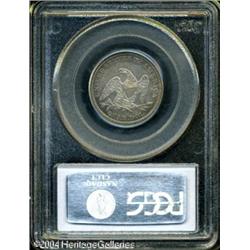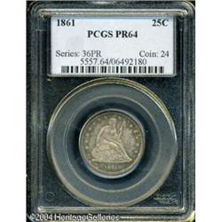 1861 25C PR64 PCGS. The 1861 is one of the more av <B>1861 25C PR64 PCGS.</B></I> The 1861 is one of the more available No Motto dates in proof format, and this is a sparkling, attractive example. Each side shows pale golden-brown centers that are surrounded by powder-blue marginal color. Population: 25 in 64, 8 finer (11/04). <BR><BR><B>Important notice:</B> Heritage usually auctions material at the rate of 200-250 lots per hour. On some occasions eBay Live bid software or the Internet may not be able to keep up with the pace of the auction. We recommend placing a realistic absentee bid now as insurance to avoid disappointment. Occasionally the auctioneer may eliminate or reject an eBay Live bid, and the auctioneer may also reopen a lot after the close of the eBay live bidding (usually because we missed an audience bid), and may reject your bid even if it shows you as the winning bidder. By bidding via eBay Live, you agree that Heritage may award the lot to another bidder at its sole discretion under the circumstances described above or any other reasonable circumstances. Since eBay bids are not shown to us until we open the lot on the floor, we treat those bids just like floor bids. In most cases the floor responds before the eBay bid is presented to us, due to Internet lag time, so for consistency we have made it a policy that floor bids are always considered first over tie eBay live bids. Also please note that all Heritage lots purchased through eBay Live carry a 20% Buyer's Premium. Please make sure you read the Terms and Conditions before you bid. This lot is being auctioned in conjunction with a live floor auction by Heritage Galleries & Auctioneers. All final auction and invoice information will be supplied by Heritage Galleries & Auctioneers, and all other information should be considered preliminary. Lot:5895