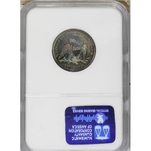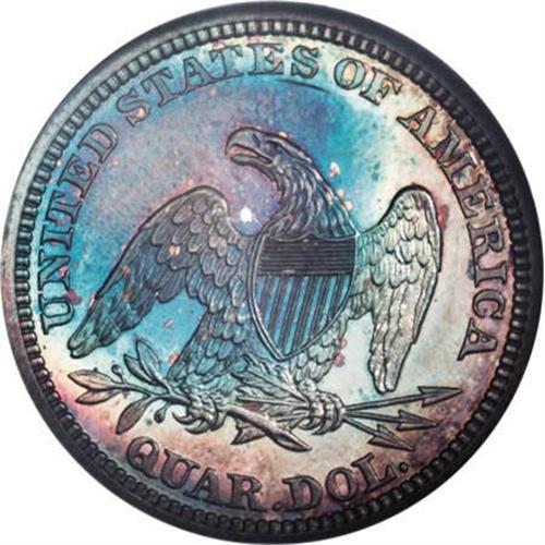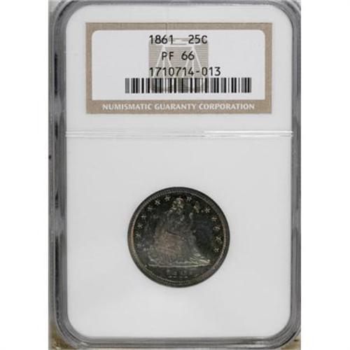 <B>1861 25C PR66 NGC.</B></I> Type Two Obverse and Reverse. A boldly struck Premium Gem proof with a beautiful pattern of patination over both clean sides. Shades of sunshine-yellow, mauve, orange, and green-blue pleasantly combine on the surfaces, and the reflectivity of the mirrors is undeniable even through the rich veil of color. PCGS and NGC combined have only graded a single example finer (12/07). <BR><BR><B>Coin Engraver:</B> Christian Gobrecht<BR><BR><b>Shipping:</b> Coins & Currency (<a target="_blank" href="http://www.heritageauctions.com/common/shipping.php">view shipping information</a>)
