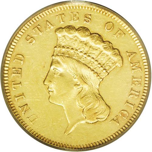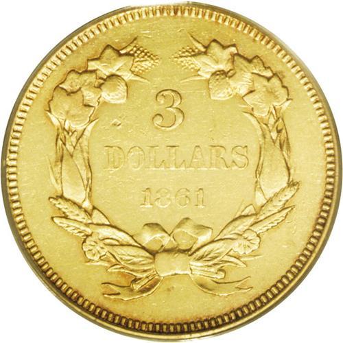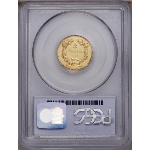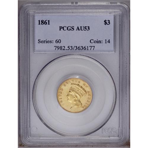 <B>1861<$3> AU53 PCGS.</B></I> A briefly circulated example of this tough Civil War date. Obverse rub is limited to Liberty's forehead, shoulder, and curl over the ear. A few light marks on the left obverse field and a small planchet flaw above the jaw are barely worthy of mention. Only 5,959 pieces were struck, discounting the 113 proofs.