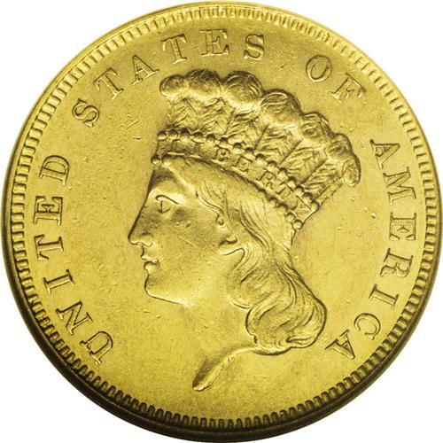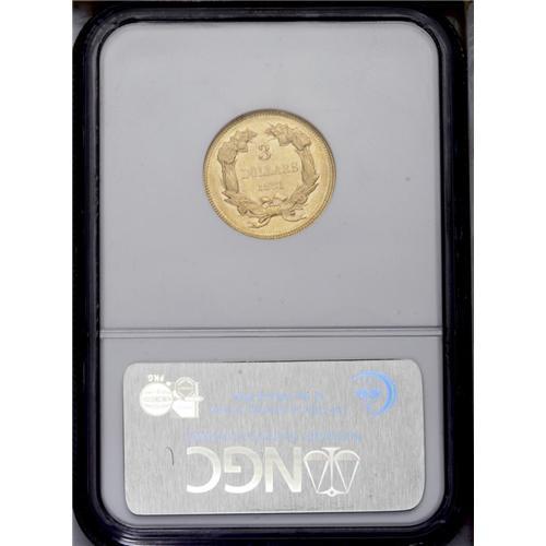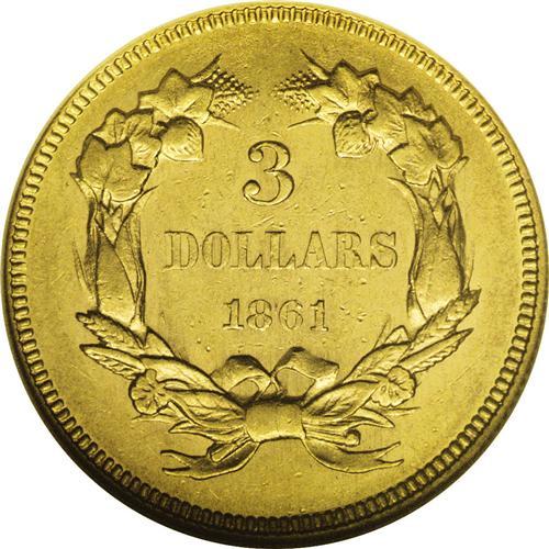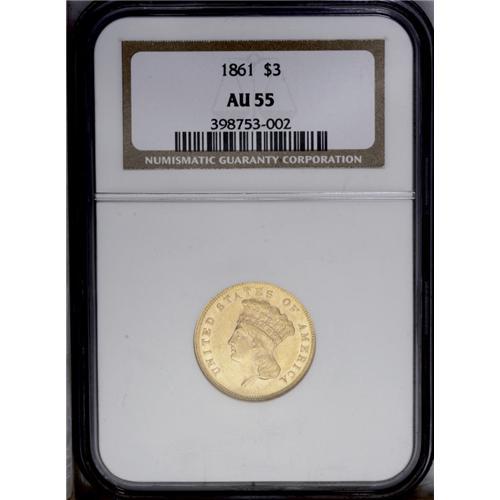 <B>1861 $3 AU55 NGC.</B></I> The 1861 is a scarcer date in the series with only 5,959 business strikes. Slight friction is seen over the highpoints, and the surfaces display bright peach-gold patination, along with luster in the recessed areas. The design features exhibit sharp definition, and a few minute marks do not distract in the least. Quite a sharp Civil War issue.