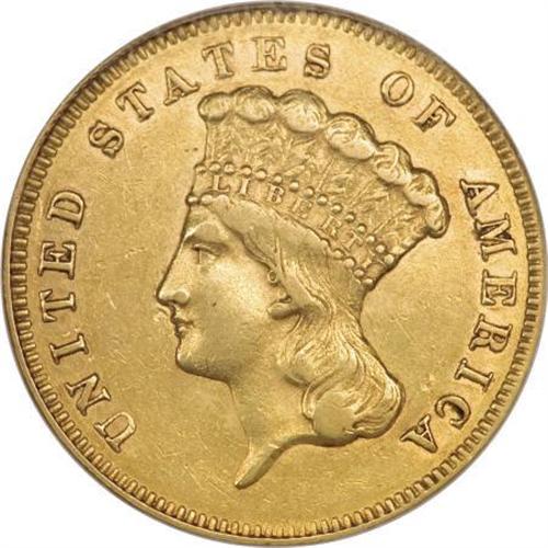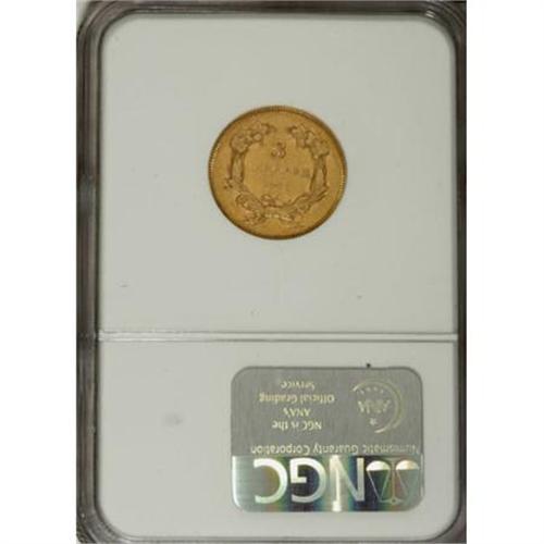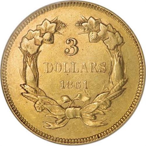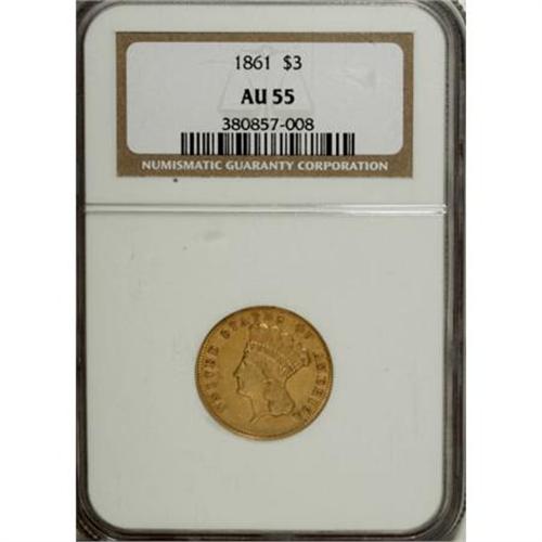 <B>1861 $3 AU55 NGC.</B></I> The 1861 was among the last three dollar gold issues to achieve anything approaching widespread circulation, as the Civil War drove silver and gold coins from circulation. Liberty's upper hair and the wreath show evidence of brief circulation, though the orange-gold fields retain much of their original luster. Minimally marked with solid eye appeal.<BR><BR><B>Coin Engraver:</B> James B. Longacre<BR><BR><b>Shipping:</b> Coins & Currency (<a target="_blank" href="http://www.heritageauctions.com/common/shipping.php">view shipping information</a>\)