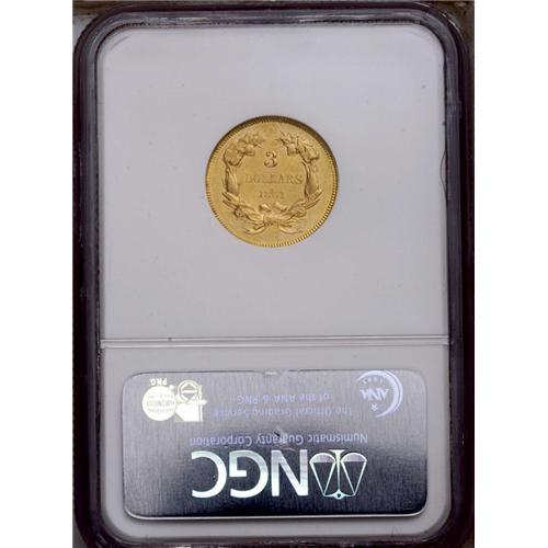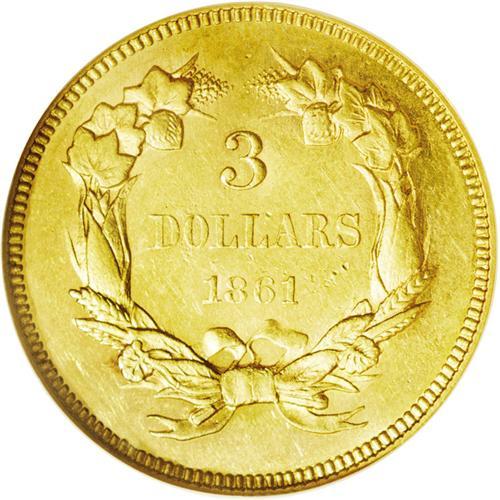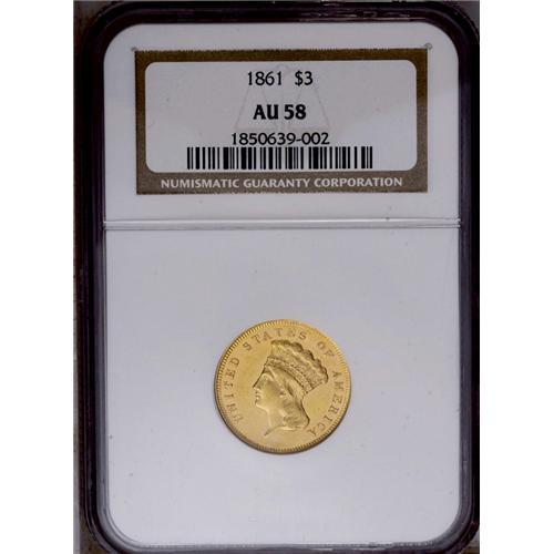 <B>1861<$3> AU58 NGC.</B></I> Slightly subdued yellow-gold surfaces retain some of the original mint luster and are very well struck throughout. A number of tiny handling marks are seen in the fields on each side. Although substantial quantities of the various other gold denominations were struck at Philadelphia during this tumultuous year, the public's disdain for the three dollar coin kept business strike production at just 5,959 pieces.