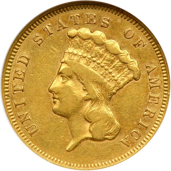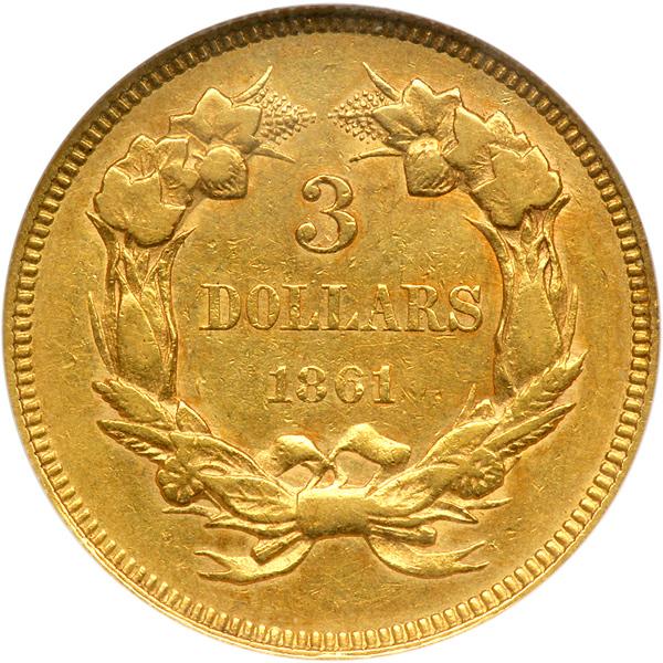 1861 $3 Gold. NGC graded VF-35. Lightly toned. Only 5,959 pieces struck. One of the scarce Civil War dates. Other than for a couple of minor scuffs in the field below ST of STATES, surfaces exceedingly choice for the grade. Some luster present (PCGS # 7982) .