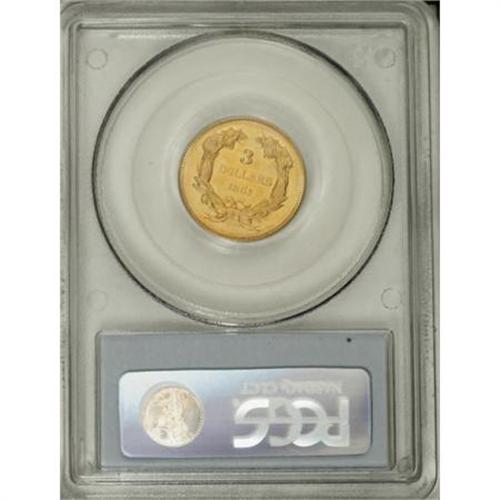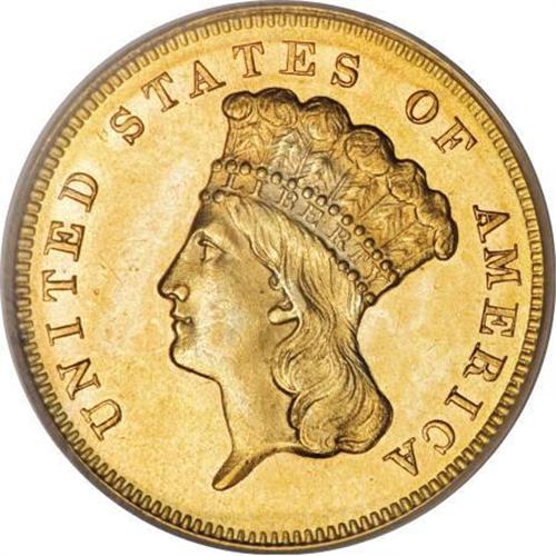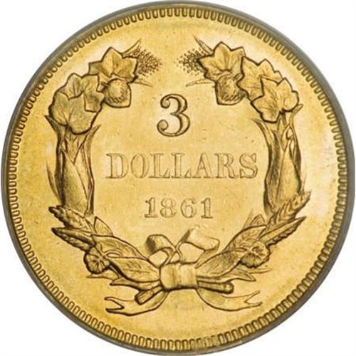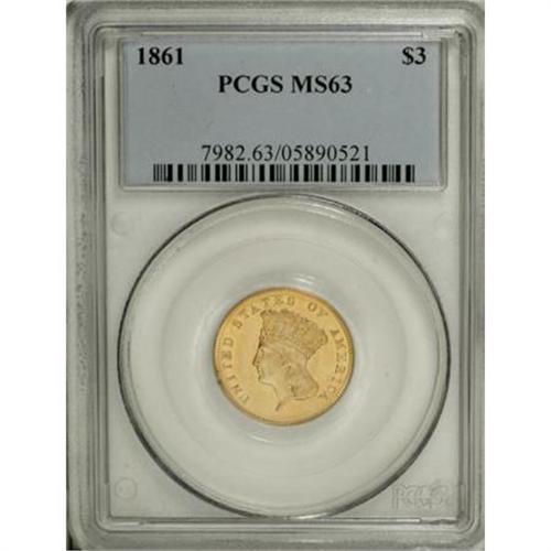 <B>1861 $3 MS63 PCGS.</B></I> A scarce and popular date that hails from the inception of the horrible War Between the States, better known as the Civil War. This issue, with a mintage of only 5,900 pieces, is seldom seen in Mint State. The present example offers lavish appeal in the form of deep orange-gold coloration tinged with greenish-gold accents on Liberty's portrait, and only a few trivial ticks appear to limit an even finer grade. Population: 13 in 63, 14 finer (12/07).<BR><BR><B>Coin Engraver:</B> James B. Longacre<BR><BR><b>Shipping:</b> Coins & Currency (<a target="_blank" href="http://www.heritageauctions.com/common/shipping.php">view shipping information</a>)