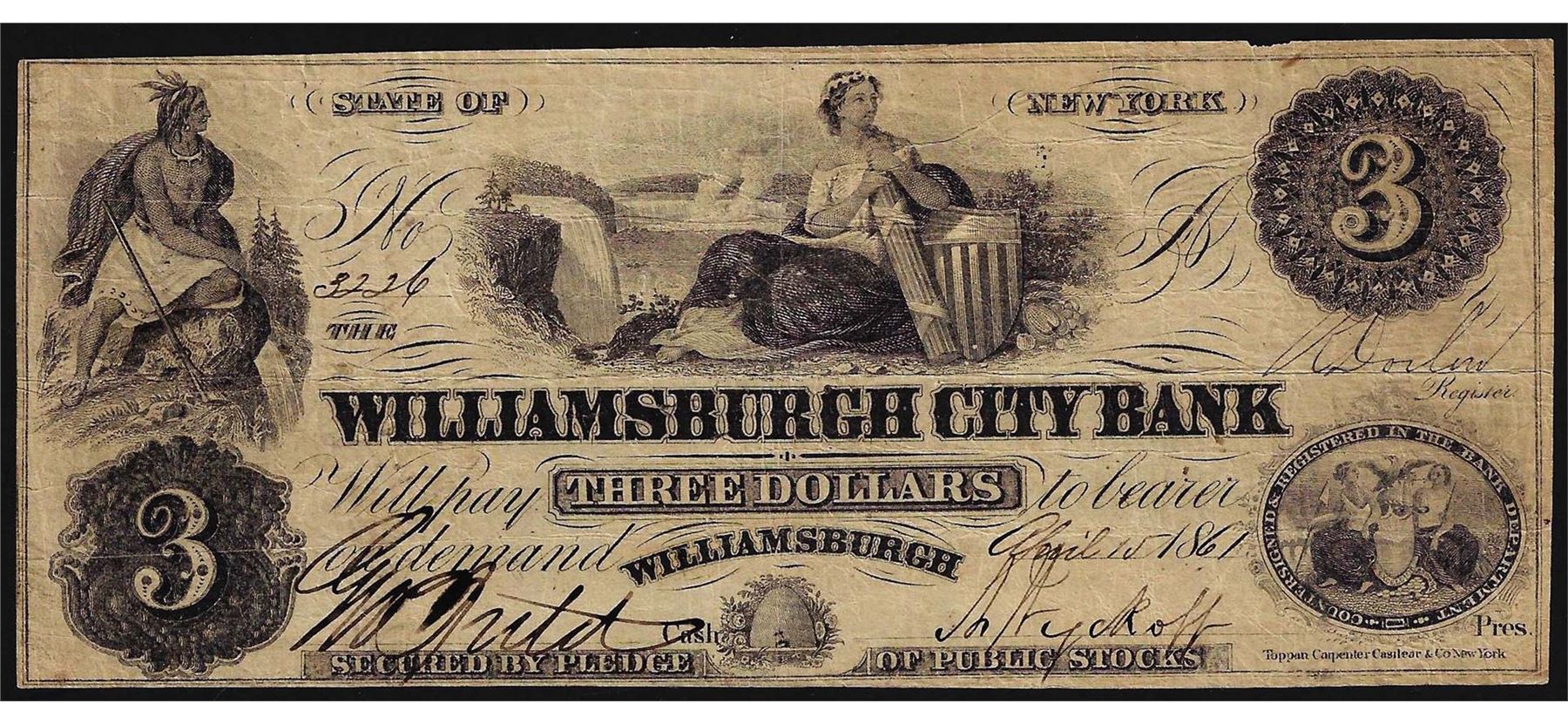 One 1861 $3 The Williamsburgh City Bank Contemporary Counterfeit Obsolete Bank Note.
