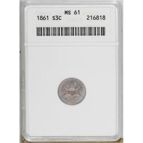 <B>1861 3CS MS61 ANACS.</B></I> NGC Census: (15/542). PCGS Population (19/533). Mintage: 497,000. Numismedia Wsl. Price for NGC/PCGS coin in MS61: $162. (#3679)<BR><BR><B>Coin Engraver:</B> James B. Longacre<BR><BR><b>Shipping:</b> Coins & Currency (<a target="_blank" href="http://www.heritageauctions.com/common/shipping.php">view shipping information</a>)