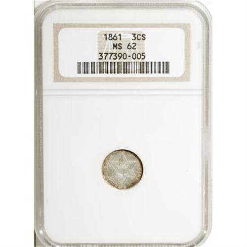 <B>1861 3CS MS62 NGC.</B></I> NGC Census: (61/474). PCGS Population (65/458). Mintage: 497,000. Numismedia Wsl. Price for NGC/PCGS coin in MS62: $171. (#3679)<BR><BR><B>Coin Engraver:</B> James B. Longacre<BR><BR><b>Shipping:</b> Coins & Currency (<a target="_blank" href="http://www.heritageauctions.com/common/shipping.php">view shipping information</a>)