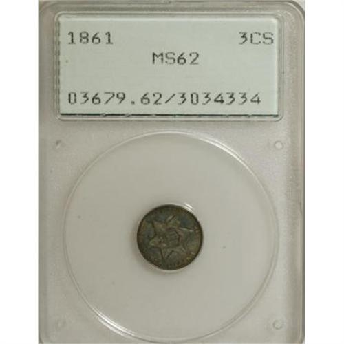<B>1861 3CS MS62 PCGS.</B></I> PCGS Population (65/457). NGC Census: (61/474). Mintage: 497,000. Numismedia Wsl. Price for NGC/PCGS coin in MS62: $171. (#3679)<BR><BR><B>Coin Engraver:</B> James B. Longacre<BR><BR><b>Shipping:</b> Coins & Currency (<a target="_blank" href="http://www.heritageauctions.com/common/shipping.php">view shipping information</a>)