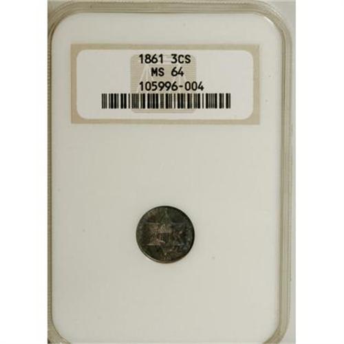 <B>1861 3CS MS64 NGC.</B></I> NGC Census: (159/212). PCGS Population (144/173). Mintage: 497,000. Numismedia Wsl. Price for NGC/PCGS coin in MS64: $380. (#3679)<BR><BR><B>Coin Engraver:</B> James B. Longacre<BR><BR><b>Shipping:</b> Coins & Currency (<a target="_blank" href="http://www.heritageauctions.com/common/shipping.php">view shipping information</a>)