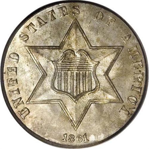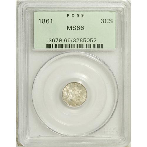 <B>1861 3CS MS66 PCGS.</B></I> Luxurious luster bathes both sides of this gorgeous Civil War era trime. The strike is sharper than usual for the type, with excellent detail apparent in the shield. Frosty surfaces are well preserved, and reveal just the slightest trace or two of light tan color. Population: 60 in 66, 22 finer (10/06).<BR><BR><b>Shipping:</b> Coin/Currency (<a target="_blank" href="http://www.heritageauctions.com/common/shipping.php">view shipping information</a>)