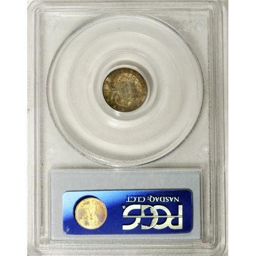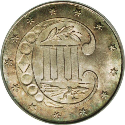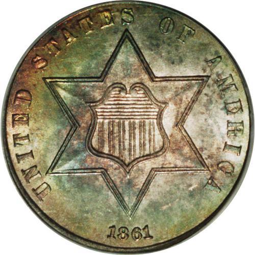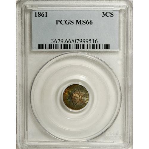 <B>1861 3CS MS66 PCGS.</B></I> The three cent silvers were among several coin denominations obliterated in the infamous "Crime of '73," but in 1861, at the start of the Civil War, they had not yet disappeared from circulation. Two years later, their mintages would never again exceed 25,000 pieces. This issue was made to the extent of nearly a half-million pieces. Beautiful jade-green and amber-gold patina graces this lustrous, delectable, and sharply struck Premium Gem. Population: 60 in 66, 22 finer (12/06).<BR><BR><b>Shipping:</b> Coin/Currency (<a target="_blank" href="http://www.heritageauctions.com/common/shipping.php">view shipping information</a>)