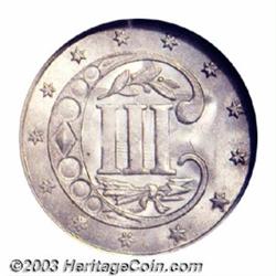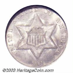 <table><tr><td><TABLE cellSpacing=0 cellPadding=0 width="100%" bgColor=#000000 border=0><TBODY> <TR><TD width="100%"><TABLE cellSpacing=1 cellPadding=3 width="100%" border=0><TBODY><TR><TD width="100%" bgColor=#79735c><FONT face=arial color=#ffffff size=3><B>Description</B> </FONT></TD></TR><TR><TD width="100%" bgColor=#ffffff><FONT face=arial size=2><B>1861 3CS MS67 NGC.</B></I> Sharply struck from heavily clashed dies, and nearly brilliant, this silver-beige Superb Gem displays attractive satiny luster and seemingly mark-free surfaces. An exceptionally well preserved coin, with haunting eye appeal. Population: 23 in 67, 5 finer (7/03). </FONT></TD></TR></TBODY></TABLE></TD></TR></TBODY></TABLE><BR><A name=PricesRealized></A><TABLE cellSpacing=0 cellPadding=0 width="100%" bgColor=#000000 border=0><TBODY><TR><TD width="100%"><TABLE cellSpacing=1 cellPadding=3 width="100%" border=0><TBODY><TR><TD width="100%" bgColor=#79735c><A name=PR><FONT face=arial color=#ffffff size=3><B>Previous Prices from Heritage Auctions</B> </FONT></A></TD></TR><TR><TD bgColor=#f6f6ed><TABLE cellSpacing=0 cellPadding=0 width="100%" border=1><TBODY><TR><TD align=middle width="33%"><B>Date</B></TD><TD align=middle width="33%"><B>Service</B></TD><TD align=middle width="33%"><B>Price</B></TD></TR><TR bgColor=whitesmoke><TD width="33%"><B>09/28/2002</B></TD><TD width="33%">PCGS</TD><TD width="33%">$2,645.00</TD></TR><TR bgColor=whitesmoke><TD width="33%"><B>10/01/2001</B></TD><TD width="33%">PCGS</TD><TD width="33%">$3,508.00</TD></TR><TR bgColor=whitesmoke><TD width="33%"><B>06/01/1999</B></TD><TD width="33%">NGC</TD><TD width="33%">$2,640.00</TD></TR></TBODY></TABLE></TD></TR><TR><TD bgColor=#ffffff><FONT face=arial size=1 ?>PLEASE NOTE: All prices realized reflect the final hammer price PLUS the buyer's premium in auctions that charge a buyer's premium. Each item has a notation at the top of the listing indicating whether that lot included a buyer's premium. Example: A item that sells with a final hammer price of $100 and a 20% buyer's premium will display with a price realized of $120. All information listed is intended to be as accurate as possible, but errors are possible. Please use this guide carefully and inform us of any inaccuracies. </FONT></TD></TR></TBODY></TABLE></TD></TR></TBODY></TABLE><BR><TABLE cellSpacing=0 cellPadding=0 width="100%" bgColor=#000000 border=0><TBODY><TR><TD width="100%"><TABLE cellSpacing=1 cellPadding=3 width="100%" border=0><TBODY><TR><TD width="100%" bgColor=#79735c colSpan=6><FONT face=arial color=#ffffff size=3><B>Price Guide*</B> </FONT></TD></TR><TR bgColor=#f6f6ed><TD align=middle><B>Grade</B> </TD><TD align=middle><B>Coin World<BR>(Trends)</B> </TD><TD align=middle><B>Numismedia<BR>Retail</B> </TD><TD align=middle><B>Numismedia<BR>Wholesale</B> </TD><TD align=middle><B>Coin<BR>Universe</B> </TD><TD align=middle><B>Heritage<BR>Value Index</B> </TD></TR><TR bgColor=#ffffff><TD align=middle>66</TD><TD align=right>$1,650.00</TD><TD align=right>---</TD><TD align=right>$1,325.00</TD><TD align=right>$1,900.00</TD><TD align=right>---</TD></TR><TR style="FONT-WEIGHT: bold" bgColor=#cccfdd><TD align=middle>67</TD><TD align=right>---</TD><TD align=right>---</TD><TD align=right>$3,850.00</TD><TD align=right>$4,600.00</TD><TD align=right>---</TD></TR><TR bgColor=#ffffff><TD align=middle>68</TD><TD align=right>---</TD><TD align=right>---</TD><TD align=right>$7,765.00</TD><TD align=right>---</TD><TD align=right>---</TD></TR><TR bgColor=#ffffff><TD colSpan=6><FONT size=1>*All information listed is intended to be as accurate as possible, but errors are possible. No item may be returned or refused based on this information which is provided as a service to our customers. You should contact each pricing source directly to determine the accuracy of this information. </FONT></TD></TR></TBODY></TABLE></TD></TR></TBODY></TABLE><BR><TABLE cellSpacing=0 cellPadding=0 width="100%" bgColor=#000000 border=0><TBODY><TR><TD width="100%"><TABLE cellSpacing=1 cellPadding=3 width="100%" border=0><TBODY><TR><TD width="100%" bgColor=#79735c><FONT face=arial color=#ffffff size=3><B>Population Guide</B> </FONT></TD></TR><TR bgColor=#ffffff><TD align=middle><!-- Begin Output of Population Grid--><TABLE cellSpacing=0 cellPadding=0 width="100%" border=0><TBODY><TR><TD vAlign=center><TABLE cellSpacing=0 width="100%" border=1 cellsadding="3"><TBODY><TR><TD vAlign=center><TABLE cellSpacing=0 cellPadding=3 width="100%" border=1><TBODY><TR><TD vAlign=center align=middle bgColor=#f0f1e8 colSpan=2 <CENTER><FONT face=Arial size=2><B>PCGS Pop </B></FONT><CENTER></CENTER></TD><TD vAlign=center align=middle bgColor=#f0f1e8 colSpan=2><CENTER><FONT face=Arial size=2><B>NGC Pop</B></CENTER></FONT></TD></TR><TR><TD vAlign=center><FONT face=Arial size=2>(67)</FONT> </TD><TD vAlign=center align=right><FONT face=Arial size=2>19</FONT> </TD><TD vAlign=center><FONT face=Arial size=2>(67)</FONT> </TD><TD vAlign=center align=right><FONT face=Arial size=2>23</FONT> </TD></TR><TR><TD vAlign=center><FONT face=Arial size=2>(>67)</FONT> </TD><TD vAlign=center align=right><FONT face=Arial size=2>0</FONT> </TD><TD vAlign=center><FONT face=Arial size=2>(>67)</FONT> </TD><TD vAlign=center align=right><FONT face=Arial size=2>5</FONT> </TD></TR></TBODY></TABLE></TD></TR></TBODY></TABLE></TD></TR></TBODY></TABLE><!-- End Output of Population Grid--></TD></TR></TBODY></TABLE></TD></TR></TBODY></TABLE><BR><TABLE cellSpacing=0 cellPadding=0 width="100%" bgColor=#000000 border=0><TBODY><TR> Important notice: Heritage usually auctions material at the rate of 200-250 lots per hour. On some occasions eBay Live bid software or the Internet may not be able to keep up with the pace of the auction. We recommend placing a realistic absentee bid now as insurance to avoid disappointment. Occasionally the auctioneer may eliminate or reject an eBay Live bid, and the auctioneer may also reopen a lot after the close of the eBay live bidding (usually because we m