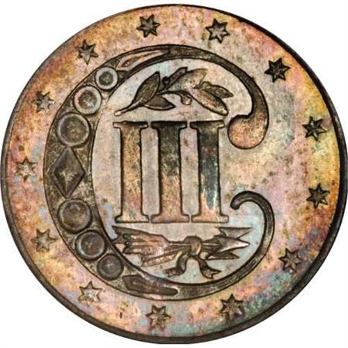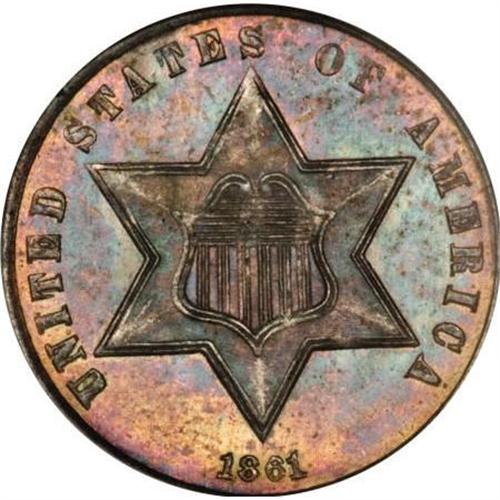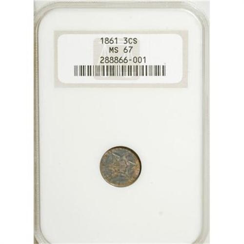 <B>1861 3CS MS67 NGC.</B></I> This Superb Gem example is housed in a early-style NGC holder. It is typically struck with some weakness noted on the shield and on the reverse stars and arrow fletchings. The piece is intensely lustrous and deeply toned in variegated shades of cobalt-blue and rose on the obverse, and more complex shadings on the reverse. This lovely example is exquisitely preserved and virtually pristine. Census: 24 in 67, 6 finer (12/07).<BR><BR><B>Coin Engraver:</B> James B. Longacre<BR><BR><b>Shipping:</b> Coins & Currency (<a target="_blank" href="http://www.heritageauctions.com/common/shipping.php">view shipping information</a>)