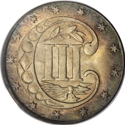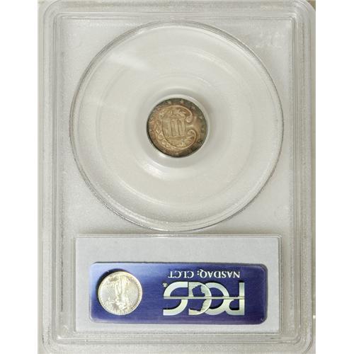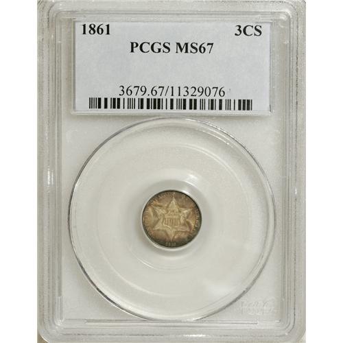 <B>1861 3CS MS67 PCGS.</B></I> This Superb Gem example has normal "coin-turn" die alignment, unlike the other similarly graded example in this sale. The digits in the date show slight doubling on this piece, but this is not one of Breen's doubled date varieties. Other parts of the obverse also show slight doubling, and it is a result of machine or strike doubling rather than a blundered die. This piece has frosty silver luster beneath deep gold, russet, and steel toning. Population: 22 in 67, 0 finer (3/07).<BR><BR><b>Shipping:</b> Coins & Currency (<a target="_blank" href="http://www.heritageauctions.com/common/shipping.php">view shipping information</a>)