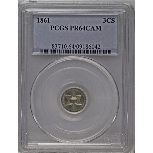<B>1861<3CS> PR64 Cameo PCGS.</B></I> Flashy and intensely reflective with excellent cameo contrast. The devices are nicely frosted and the whole of the coin has pale golden patina. Population: 8 in 64 Cameo, 2 finer (7/06).
