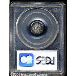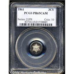 <B>1861<3CS> PR65 Cameo PCGS.</B></I> Boldly struck with deep, mottled russet and sea-green toning on both the obverse and reverse. A remarkable cameo contrast is presented, and only a couple of minor contact marks on the Roman numerals preclude an even higher grade. Much rarer than the mintage would indicate.<BR><I>Ex: Quality Sales (1/70), lot 285, where it realized $110.</B></I> <BR><BR><B>Important notice:</B> Heritage usually auctions material at the rate of 200-250 lots per hour. On some occasions eBay Live bid software or the Internet may not be able to keep up with the pace of the auction. We recommend placing a realistic absentee bid now as insurance to avoid disappointment. Occasionally the auctioneer may eliminate or reject an eBay Live bid, and the auctioneer may also reopen a lot after the close of the eBay live bidding (usually because we missed an audience bid), and may reject your bid even if it shows you as the winning bidder. By bidding via eBay Live, you agree that Heritage may award the lot to another bidder at its sole discretion under the circumstances described above or any other reasonable circumstances. Since eBay bids are not shown to us until we open the lot on the floor, we treat those bids just like floor bids. In most cases the floor responds before the eBay bid is presented to us, due to Internet lag time, so for consistency we have made it a policy that floor bids are always considered first over tie eBay live bids. Also please note that all Heritage lots purchased through eBay Live carry a 20% Buyer's Premium. Please make sure you read the Terms and Conditions before you bid.