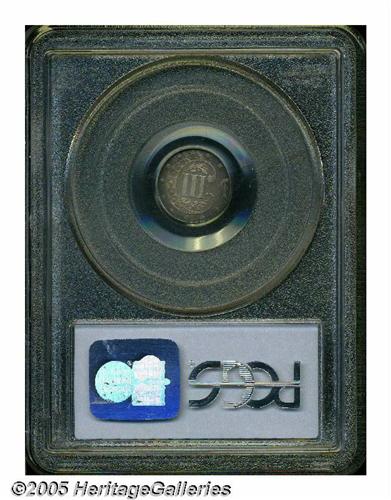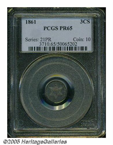 <B>1861<3CS> PR65 PCGS.</B></I> Lovely deep mauve and sea-green toning endows this well struck and essentially pristine Gem. A small charcoal-colored toning spot is on the upper centril of the obverse star. Population: 17 in 65, 5 finer (5/05).