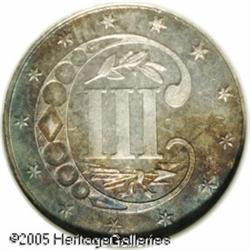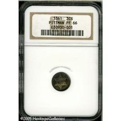 <B>1861 3CS PR66 NGC.</B></I> Ex: Pittman. Blue-green and dusky brick-red toning seems to cling to the obverse devices, while similar colorations form a crescent at the lower portion of the reverse. The Gem quality surfaces are a step above the typical 1861 proof. Population: 7 in 66, 1 finer (1/05). Lot:5676
