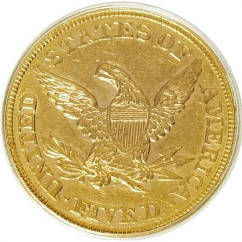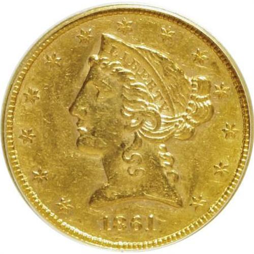 <B>1861 $5 AU50 PCGS.</B></I> PCGS Population (72/453). NGC Census: (75/1021). Mintage: 688,150. Numismedia Wsl. Price for NGC/PCGS coin in AU50: $256. (#8288)<BR><BR><B>Coin Engraver:</B> Christian Gobrecht<BR><BR><b>Shipping:</b> Coins & Currency (<a target="_blank" href="http://www.heritageauctions.com/common/shipping.php">view shipping information</a>)