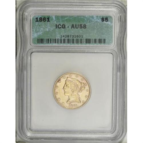 <B>1861 $5 AU58 ICG.</B></I> NGC Census: (420/245). PCGS Population (98/167). Mintage: 688,150. Numismedia Wsl. Price for NGC/PCGS coin in AU58: $500. (#8288)<BR><BR><B>Coin Engraver:</B> Christian Gobrecht<BR><BR><b>Shipping:</b> Coins & Currency (<a target="_blank" href="http://www.heritageauctions.com/common/shipping.php">view shipping information</a>\)