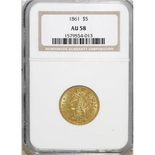 <B>1861 $5 AU58 NGC.</B></I> . NGC Census: (446/249). PCGS Population (105/173). Mintage: 688,150. Numismedia Wsl. Price for NGC/PCGS coin in AU58: $500. (#8288)<BR><BR><B>Coin Engraver:</B> Christian Gobrecht<BR><BR><b>Shipping:</b> Coins & Currency (<a target="_blank" href="http://www.heritageauctions.com/common/shipping.php">view shipping information</a>)