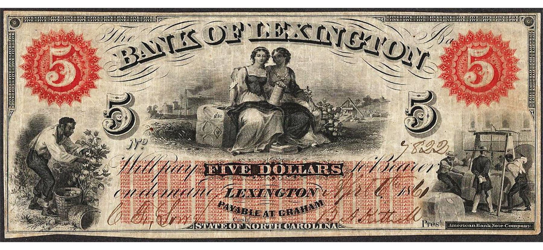 One 1861 $5 Bank of Lexington North Carolina Obsolete Note.