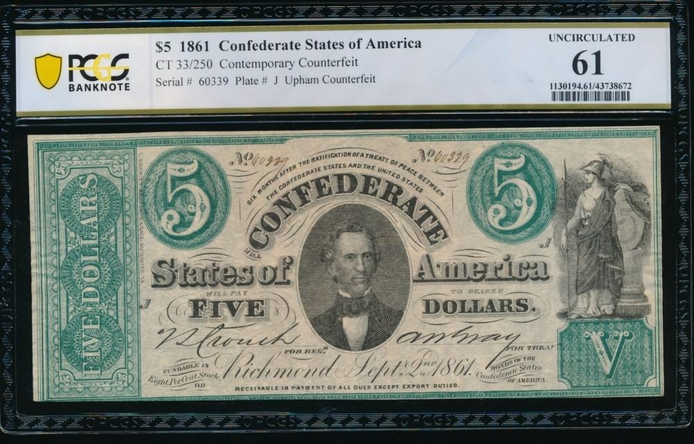One 1861 $5 CT-33 Confederate PCGS 61.