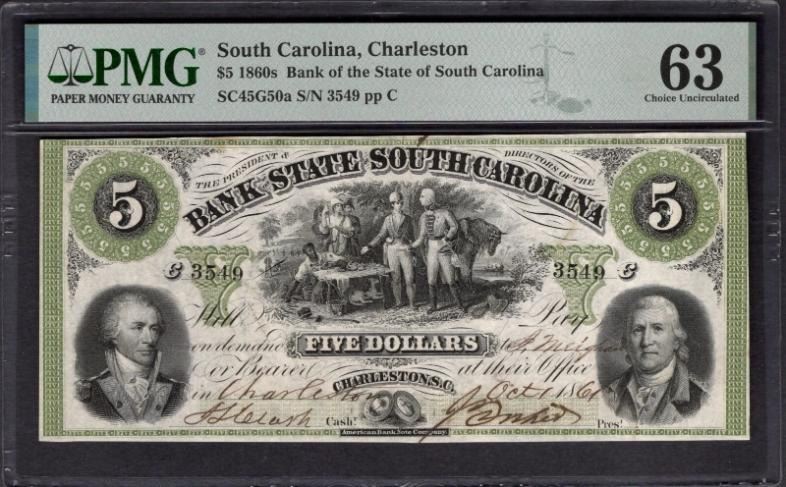 One 1861 $5 Charleston SC Obsolete PMG 63.