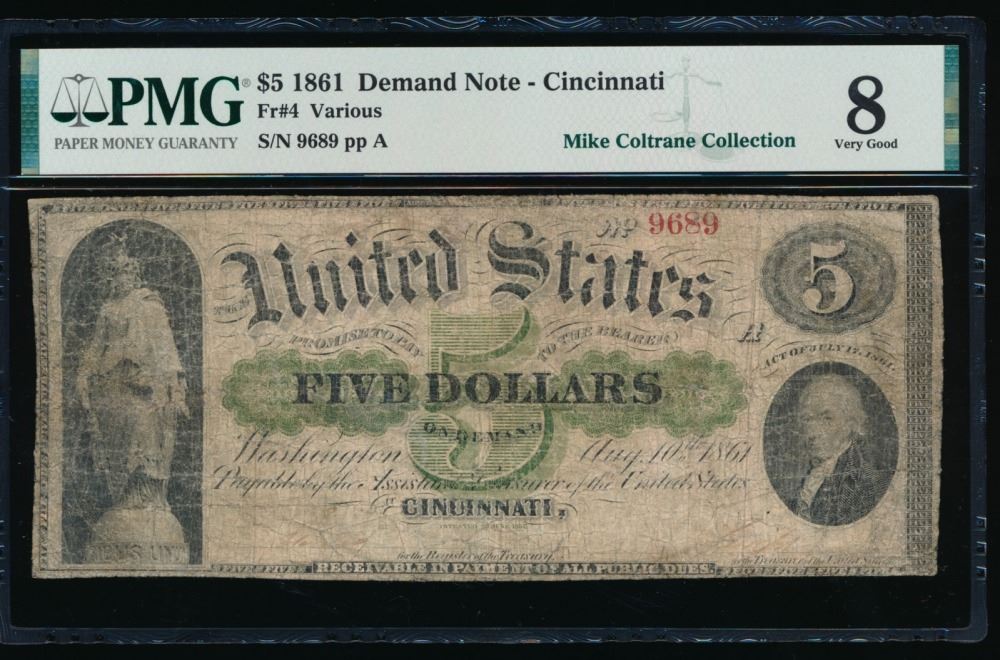 One 1861 $5 Cincinnati Demand Note PMG 8.