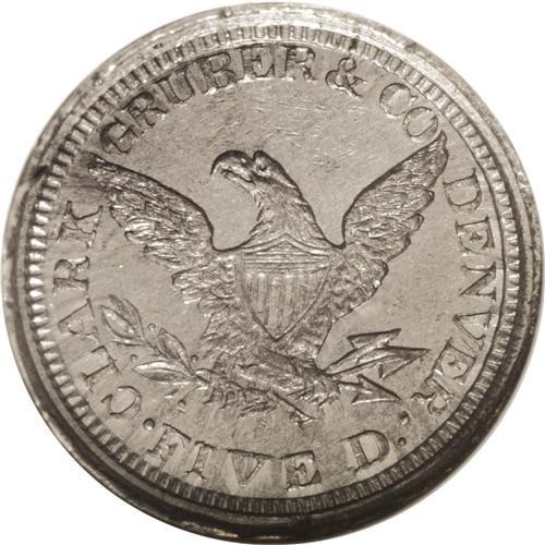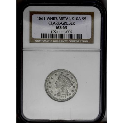 <B>1861<$5> Clark, Gruber $5 White Metal Die Trial MS63 NGC.</B></I> K-10a, R.8. An even finer example of this important trial striking for the second year of production of this private mint. The Clark, Gruber partnership stepped in and filled a void in the local economy after the recent gold and silver strikes. Just as in California a decade earlier, there was little circulating coinage in Colorado, but more importantly there was no practical way to convert the newly discovered ore into spendable coin form. Clark and Gruber never intended to be anything more than a stop-gap measure until the federal government could provide coinage for local citizens. They produced gold coins and notes for two years in two locations (Denver and Central City), and in 1863 they sold their facilities to the United States government. The United States Mint at Denver opened for business in late 1863 as a United States Assay Office.<BR> This piece has bright remnants of the original white metal around the reverse devices with light to medium gray patina seen elsewhere. A bit weakly defined, as expected, the surfaces display numerous contact marks with the most obvious ones located at the base of the truncation of Liberty's neck.<BR><I>Accompanied by an NGC Photo Proof.</B></I>