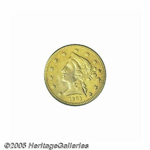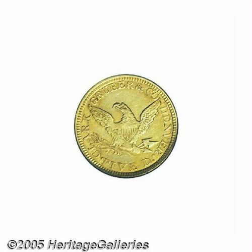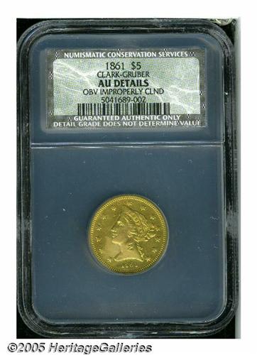 <B>1861<$5> Clark, Gruber & Co. Five Dollar AU Details, Obverse Improperly Cleaned, NCS.</B></I> K-6. R.4. Harshly cleaned on the left obverse, especially near Liberty's chin. The reverse has also been cleaned, although much more mildly. Luster dominates the reverse border. The Denver facilities of Clark, Gruber & Co. were sold to the U.S. Government shortly thereafter, and were used as an assay office, which eventually evolved into the Denver Mint. Listed on Page 309 of the 2005 <I>Guide Book.</B></I><BR><I>From The Great Western Collection of Territorial Gold.</B></I>
