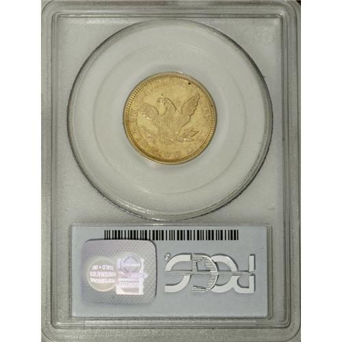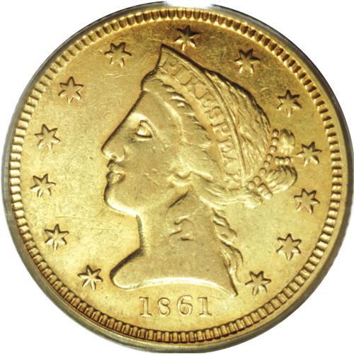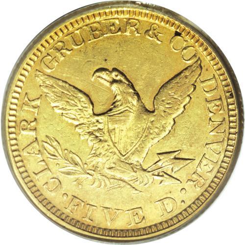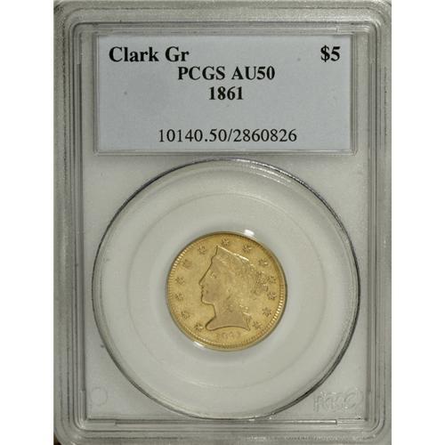 <B>1861 $5 Clark, Gruber & Co. Five Dollar AU50 PCGS.</B></I> K-6, R.4. Second and final year of issue for the firm of Clark, Gruber. Significant amounts of mint luster still surround the devices on this rich yellow-gold coin. The devices are weakly defined, as usual. Overall, the surfaces are minimally abraded, but there is an angling planchet lamination in the center of the reverse that extends upward into the field. Listed on page 363 of the 2007 <I>Guide Book.</B></I><BR><BR><b>Shipping:</b> Coins & Currency (<a target="_blank" href="http://www.heritageauctions.com/common/shipping.php">view shipping information</a>)