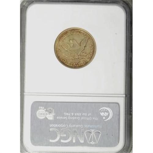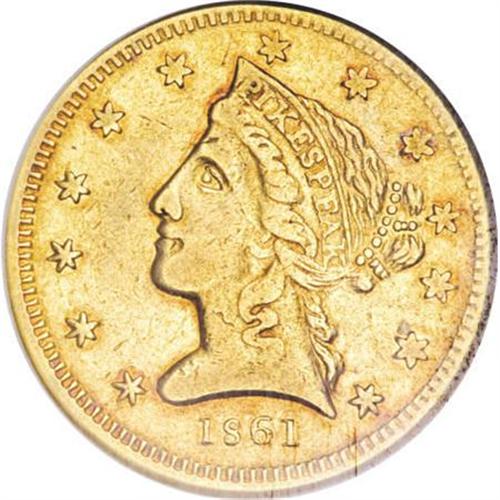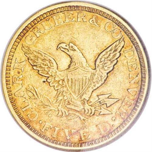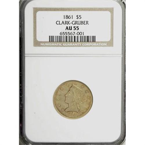 <B>1861 $5 Clark, Gruber & Co. Five Dollar AU55 NGC.</B></I> K-6, R.4. Kagin notes that these pioneer gold pieces are: "Generally very weak in center." This is not too surprising, considering that the coins were struck on a small, hand-operated coining press. In other respects, however, these Colorado gold rush pieces were a godsend, allowing miners to exchange their gold dust at honest rates, and promoting a standard system of local exchange in the vicinity of modern-day Denver. This example shows modest wear and a few small surface blemishes, with green-gold coloration that yields to red-orange luster remnants near the borders. Listed on page 367 of the 2008 <I>Guide Book</B></I>. Census: 13 in 55, 14 finer (1/08).<BR><BR><b>Shipping:</b> Coins & Currency (<a target="_blank" href="http://www.heritageauctions.com/common/shipping.php">view shipping information</a>)