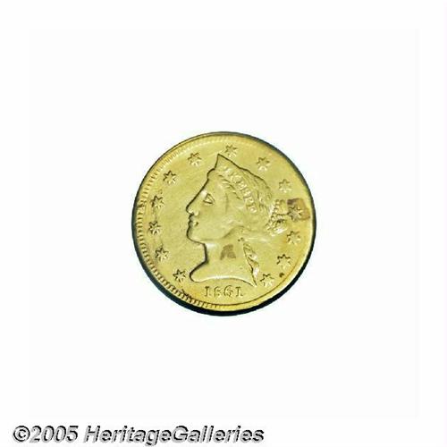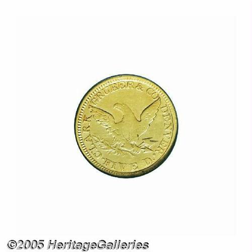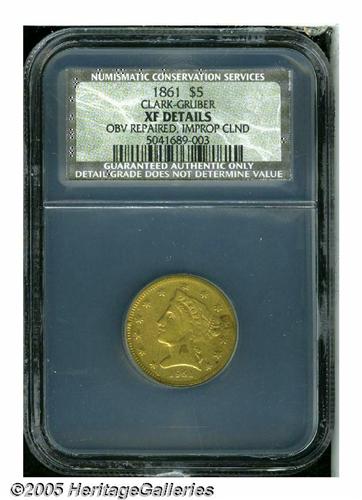 <B>1861<$5> Clark, Gruber & Co. Five Dollar XF Details, Obverse Repaired, Improperly Cleaned, NCS.</B></I> K-6. R.4. This typically struck and thoroughly cleaned straw-gold piece has been re-engraved between stars 2 and 4. The obverse has several pinscratches and a pair of russet stains. Despite its problems, many collectors would cherish this example for its link to the historic Colorado Gold Rush of the early 1860s. Listed on Page 309 of the 2005 <I>Guide Book.</B></I><BR><I>From The Great Western Collection of Territorial Gold.</B></I>