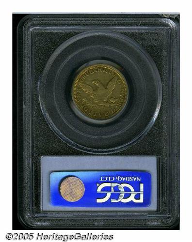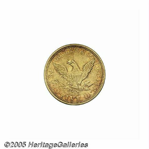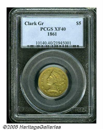 <B>1861<$5> Clark, Gruber & Co. Five Dollar XF40 PCGS.</B></I> K-6. R.4. As in 1860, the most important of the Colorado private minters struck four different gold denominations in 1861. Unlike the 1860 Ten and Twenty Dollar issues, all four 1861 designs imitated Federal motifs. On the present piece, orange and ruby-red tints alternate across the peripheries, while pale greenish-gold hues consume the centers. The strike is good for the grade and private mint, and the absence of unpleasant abrasions confirms the quality. Listed on Page 309 of the 2005 <I>Guide Book.</B></I><BR><I>From The Great Western Collection of Territorial Gold.</B></I>