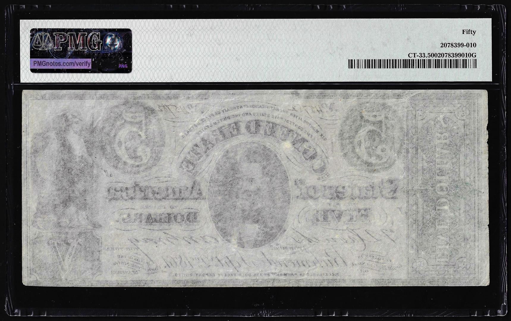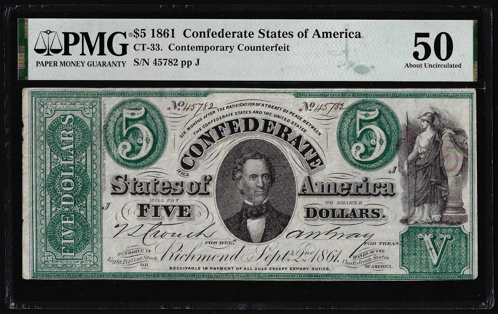One 1861 $5 Confederate States Contemporary Counterfeit Note CT-33 PMG About Unc. 50. PMG Certified.