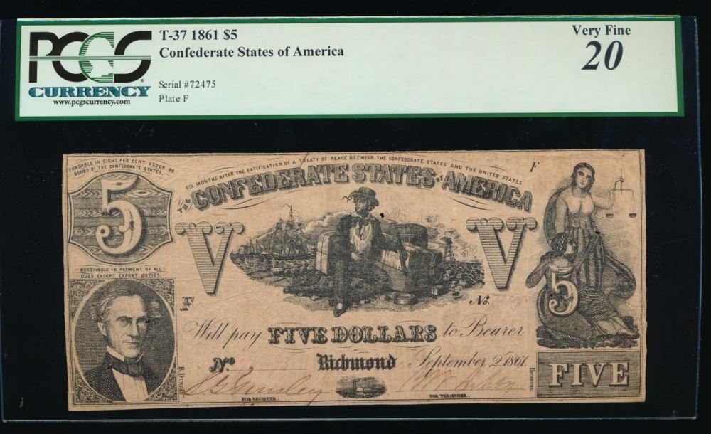 One 1861 $5 Confederate States of America Note PCGS 20.