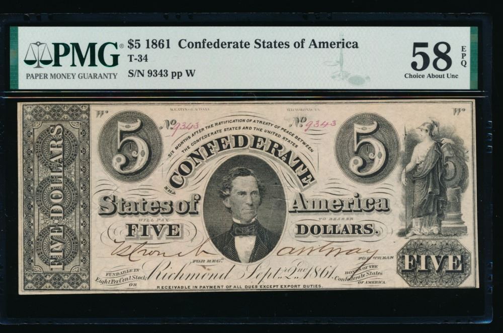 One 1861 $5 Confederate States of America Note PMG 58EPQ.