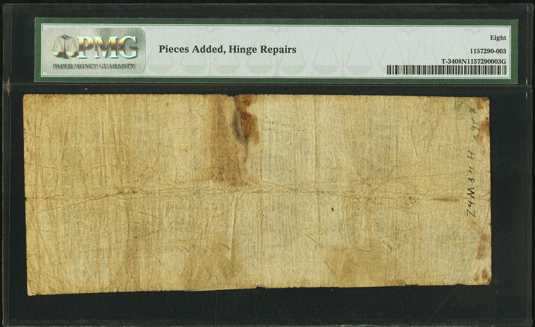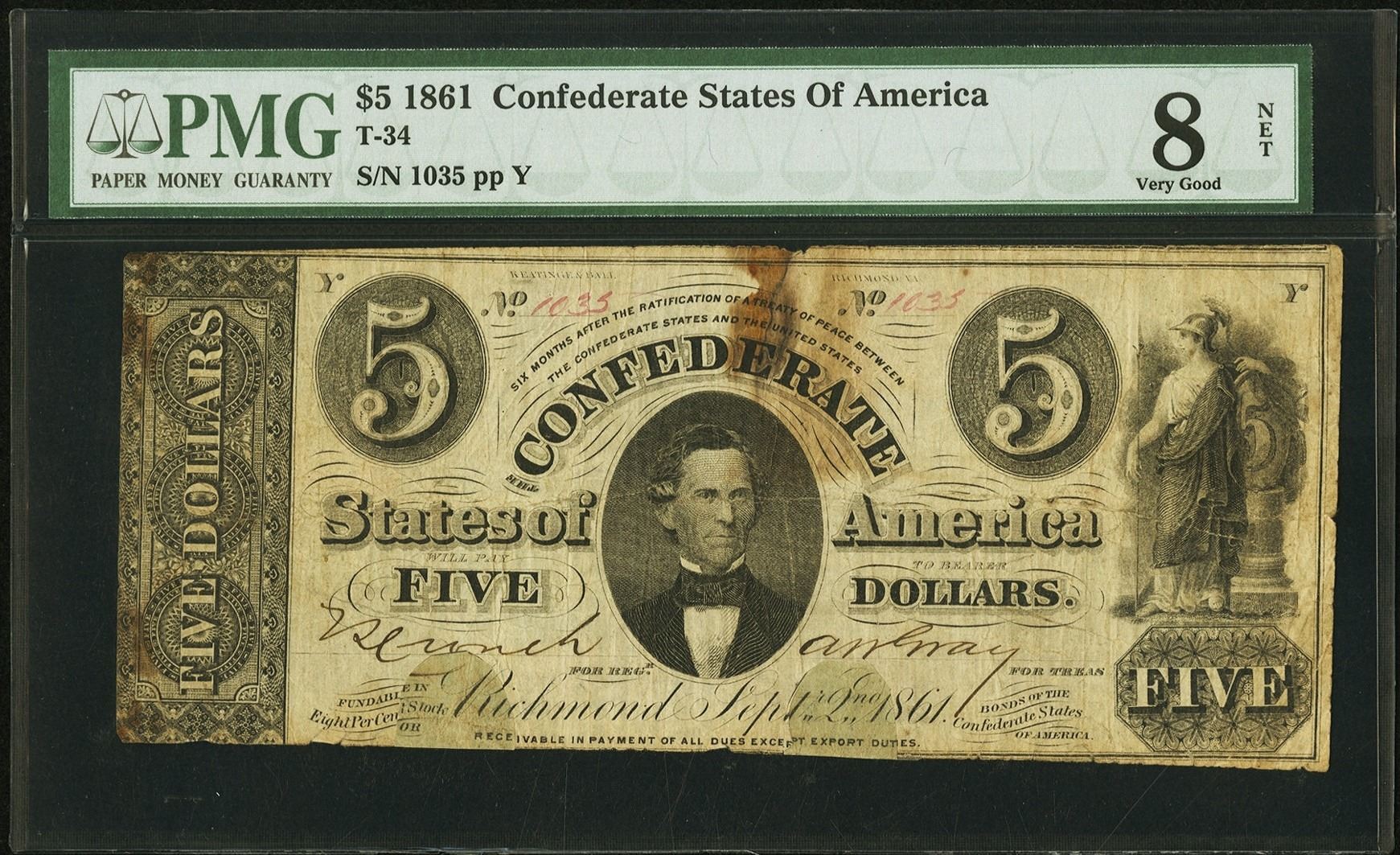 One 1861 $5 Confederate States of America Note PMG 8NET.